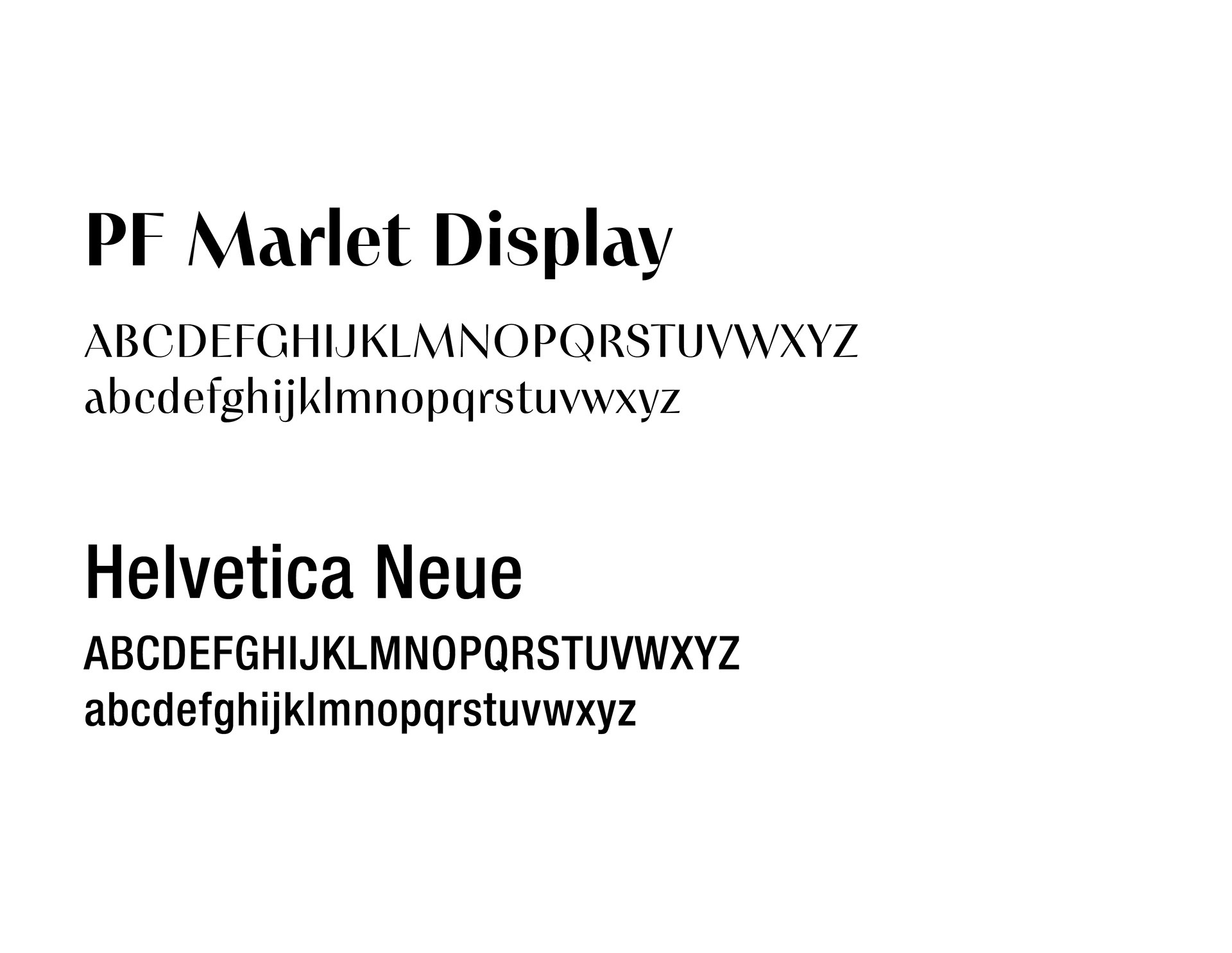 I settled on PF Marlet Display for my primary font because I felt it best blended classical and modern luxury styles. I paired it with Helvetica Neue, for its versatility and visual similarities to my primary font.